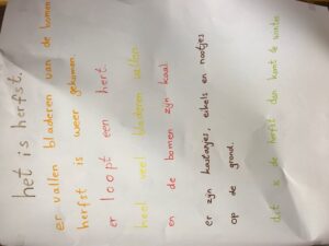 Het laatste nieuwtje is dat de kinderen met de hele groep een tekst kunnen ‘schrijven’. Ze bedenken met elkaar wat ze willen vertellen en de stamgroepleider schrijft dit op een groot vel. Zo zien ze de relatie tussen gesproken en geschreven taal.