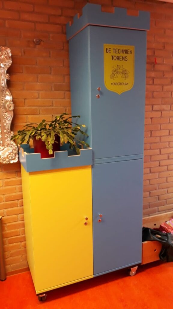 Op de Kade hebben we sinds kort een techniektoren. Deze toren ziet er niet alleen heel leuk uit in de gang maar is ook super interessant en leerzaam. In deze toren staan allerlei dozen met proefjes en opdrachten die de kinderen kunnen doen in de groep. Sommige opdrachten zijn geschikt om met de hele groep uit te voeren en andere dozen kun je goed in kleine groepjes uitproberen. Er is bijvoorbeeld een doos die we bij het vorige thema met alle klassen hebben gebruikt. Bouw een huis van kleine baksteentjes met cement, elke klas ging hiermee verder. Een ander voorbeeld is bouw een brug van blokken en/of lego die stevig genoeg is om plastic dieren overheen te laten lopen.