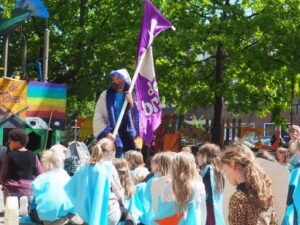 Gelukkig, de school staat er nog!! En dat is te danken aan alle Brugkinderen die vorige week tijdens de kampdagen ervoor gezorgd hebben dat de Investeerders zijn verdwenen. Er is 3 dagen lang hard gewerkt en gespeeld, er zijn vele opdrachten voltooid, banieren verdiend en schilden geverfd met als resultaat dat koning Arthur onze school wist te vinden en ons heeft gered. Geen parkeergarage dus, maar onze prachtige school kan blijven staan. Wat waren het fantastische dagen met als slotstuk op vrijdag de heldendaden van iedere stamgroep. Mooi om te zien hoe ieder Ridderhuis heeft bijgedragen. Het weer zat niet alle dagen mee, maar wat waren de Ridderhuizen dapper en bleven ze door strijden voor het behoud van de Brug.